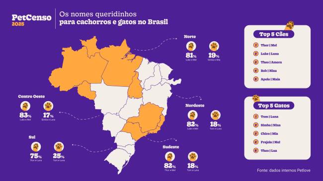 Entre os nomes preferidos para cães, o top 3 nacional é composto por Mel, Luna e Amora, refletindo uma preferência por nomes curtos e afetivos – e comprovando, também, o dado de que as fêmeas têm dominado o cenário pet. Thor e Luke também aparecem em destaque, indicando forte influência de referências da cultura pop. Outros nomes que figuram entre os dez mais populares são Nina, Maia, Meggie, Pandora e Theo.