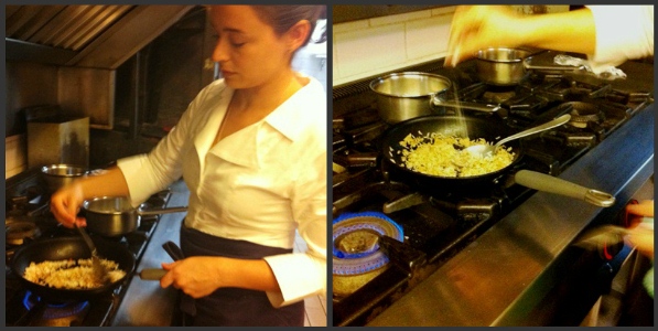 Refogue o dente alho e a cebola no azeite quente. Adicione o arroz e refoque-o até secar (1). Acrescente o caldo de legumes quente, uma pitada grande de sal e a folha de louro. Quando o caldo ferver, abaixe o fogo e tampe a panela. Cozinhe o arroz por vinte minutos ou até que esteja macio, porém ainda resistente. Tempere o arroz com mais sal se necessário (2) e a salsinha.