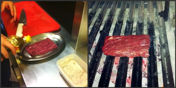Tempere a fraldinha com sal e pimenta. Passe um fio de azeite para não grudar na grelha (1) e grelhe-a deixando-a ao de ponto para malpassada (2). Pode ser preparada também na frigideira antiaderente.