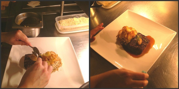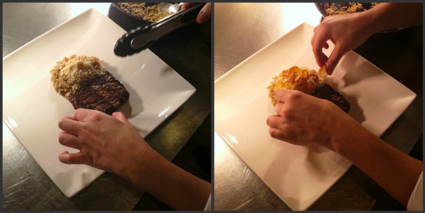 Puxe o arroz no caldo que sobrar da carne depois de grelhada. Coloque o arroz no prato (1). Sobre o arroz, disponha um pouco da farofa (2). Ao lado, acrescente o bife grelhado (3). Use a batata portuguesa para enfeitar o arroz e a farofa (4). Sobre a fraldinha, coloque uma quenelle do purê de alho (5) e sobre a quenelle, os brotos de salsinha. Limpe o prato e sirva em seguida (6).