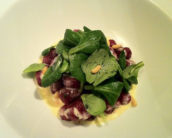 Nhoque de beterraba ao creme de queijo fontina aromatizado por laranja com agrião: um dos primeiro pratos do chef (Foto: Arnaldo Lorençato)