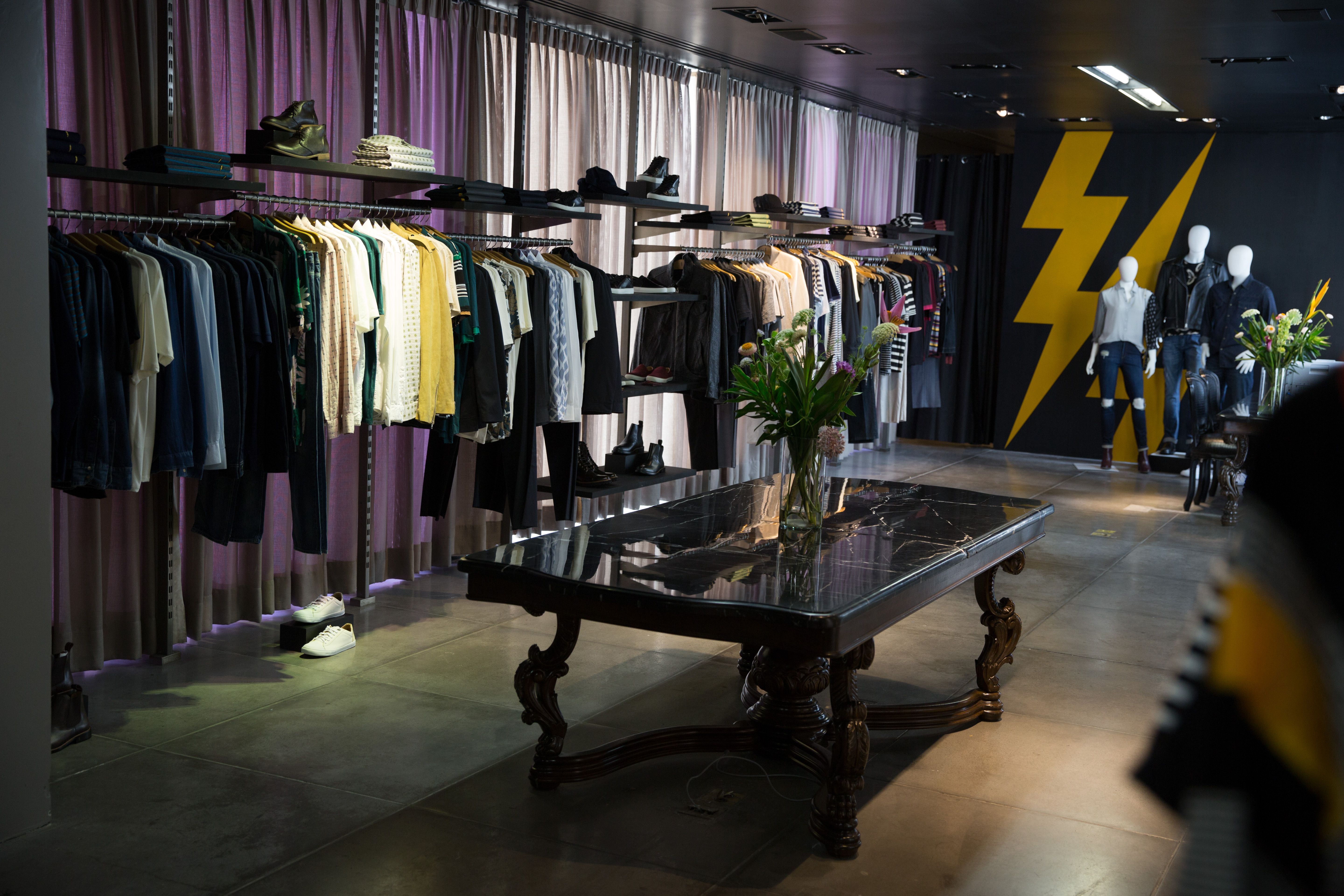 No caixa, o tradicional balcão dá lugar a uma mesa de mármore. Um dos itens mais procurados é o macacão masculino em jeans com texturas diferentes para a parte de cima e a de baixo que vale 729 reais. O artigo mais em conta é uma regata de malha que sai por 114 reais.