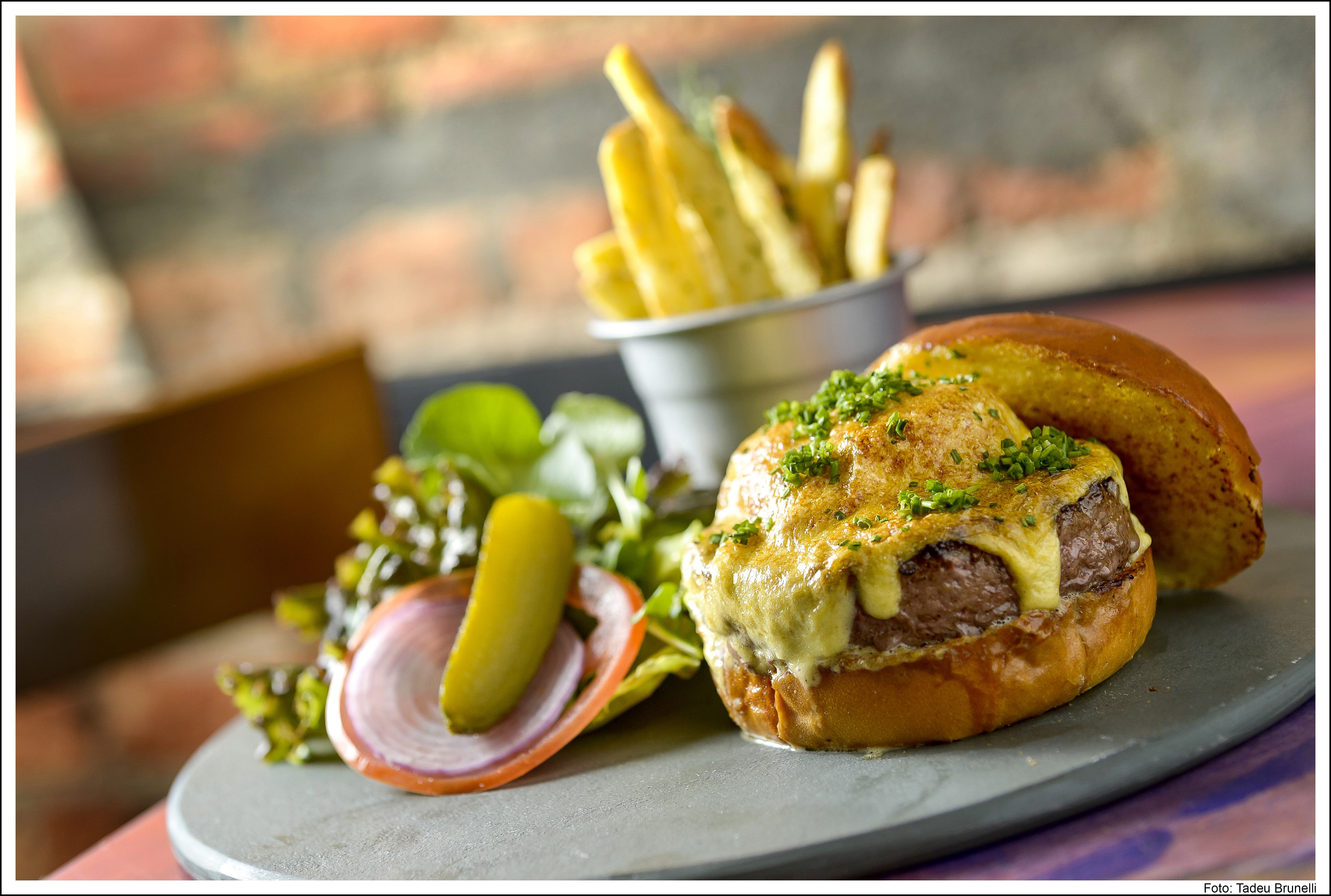 – Duck burger: hambúrguer de pato com pele de porco braseado mais vinagrete de maçã e laranja (Greigor Caisley)