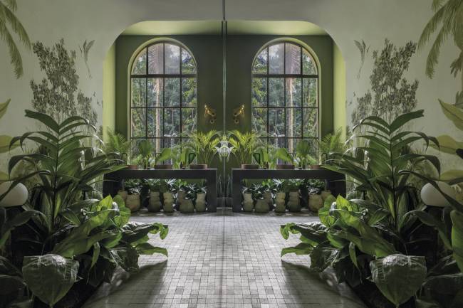 “Eu faço trilha, usei essa experiência como inspiração, de caminhar e chegar a uma área de clareira”, explica Priscila. Para completar a composição natural, as arquitetas empregaram espécies como palmeira-de-petrópolis, lírio-do-amazonas, orelha-de-elefante e dracena poá.