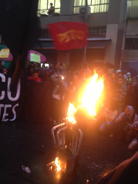 Em frente ao local, atearam fogo em uma catraca de ônibus falsa. Logo após, eles continuaram a passeata, caminhando pela Rua São Bento e Praça do Patriarca até a Praça da Sé, onde queimaram mais uma catraca falsa. Após discurso dos integrantes do MPL, o ato terminou por volta das 18h20.