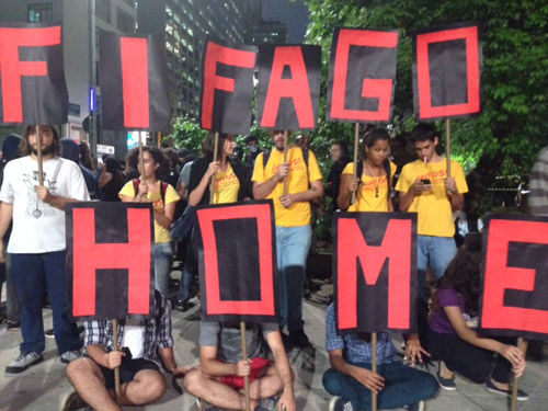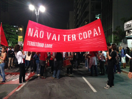 A primeira manifestação contra a Copa, em janeiro, ficou marcada pela violência. Um fusca pegou fogo com uma família dentro logo após passar por um colchão em chamas. O fogo foi ateado por black blocs, que também quebraram bancos, vidraças de prédios residenciais e ônibus. No fim, 146 pessoas foram detidas. Um manifestante, Fabrício Chaves, levou dois tiros de policiais.